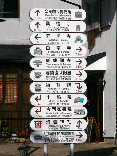在等紅綠燈的時候,我們看到馬路對面立著一連串的景點路牌:往北,是奈良國立博物館與興福寺,當然,還可以加上這裡沒有掛出來的東大寺和春日大社;朝東,有白毫寺、新藥師寺、志賀直哉舊居和入江泰吉紀念館;東南角上,只見福智院孤伶伶地杵在那裡;轉向西邊,元興寺、十輪院和今西家書院隱藏在一大片民宅之間......那裡,就是傳說中的奈良町。戀京癮士 發表在 痞客邦 留言(14) 人氣(385)